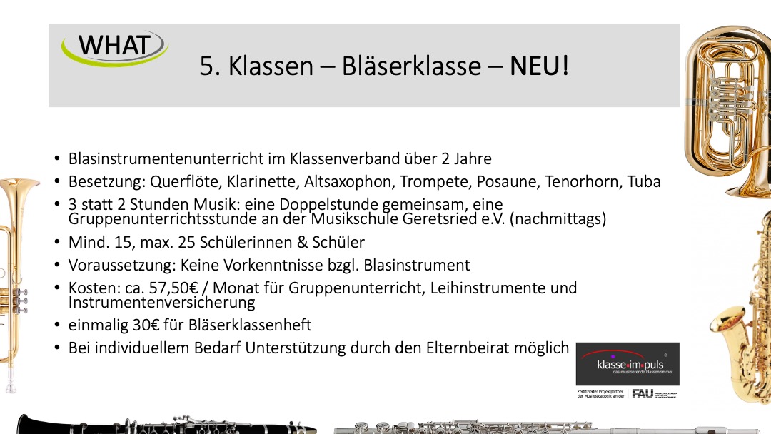 Information zum Unterrichtsangebot: Im Schuljahr 2025/26 gibt es eine Gitarrenklasse im zweijährigen Turnus (5./6. Jahrgangsstufe). Zudem können unsere Fünftklässler bei Interesse zwischen drei Neigungsangeboten wählen: Forschen, Sport und Kunst 3D. Diese finden 14-tägig von 13.30 – 15:00 Uhr statt. Genauere Informationen zu diesen Angeboten können Sie den nebenstehenden Flyern entnehmen und sich hierfür bei der Onlineanmeldung eintragen.